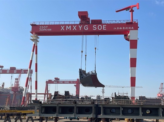 造船(chuán)門(mén)式起重機(jī)是(shì)工(gōng)作(zuò)在造船(chuán)廠(chǎng)的(de)船(chuán)塢、船(chuán)台或平台上(sh$àng)進行(xíng)船(chuán)體(tǐ)分(fēn)段吊裝及翻身(shēn)作(zuò)業(yè)的(de)專用(yòng→)起重設備。